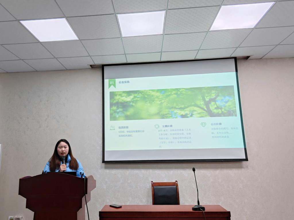 校级优秀暑期社会实践团队负责人彭欣宇(2021级档案学专业)从社会实践本身、后期的文本撰写以及其他问题这三个方面对暑期社会实践进行了介绍。她总结了团队的经验教训,一个是因为社会实践是团队合作的形式,一定要做好团队分工,每个人要各司其职,而且要积极沟通。二是在积极进行媒体投稿和多平台宣传,可以准备新闻稿、宣传视频等多样化的宣传素材,因为社会影响力也是团队答辩评分的重要维度,如果团队没有报道渠道的话,一定要去联系指导老师和学院,主动寻求帮助。