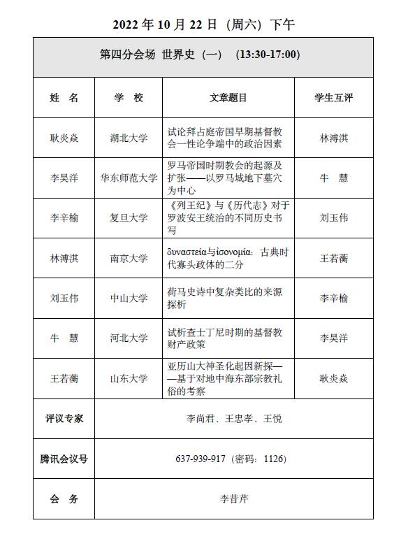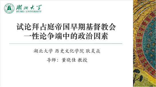 我院历史学专业2019级本科生耿炎焱以线上方式参与本次论坛。在22日下午的第四分会场,耿炎焱同学对她的论文《试论拜占庭帝国早期基督教会一性论争端中的政治因素》进行了汇报,并得到了与会专家上海师范大学历史系李尚君老师、复旦大学历史学系王忠孝老师与华东师范大学历史学系王悦老师的宝贵建议,在本次论坛中收获良多。