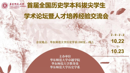 2022年10月22日至23日,由华东师范大学卓越学院、华东师范大学教务处、华东师范大学历史学系主办的“首届全国历史学本科拔尖学生学术论坛暨人才培养经验交流会”成功举行。本届论坛共遴选出参会论文37篇,吸引了全国25所高校、七十余位专家学者和本科生的参与。