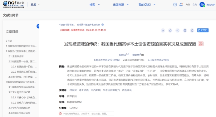 近日,我院青年教师徐欣欣作为第一作者在《中国图书馆学报》发表题为《发现被遮蔽的传统:我国当代档案学本土话语资源的真实状况及成因探赜》的学术论文,全文约2万字。这是我院青年教师首次在该期刊发文。