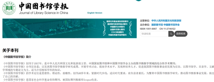 《中国图书馆学报》创刊于1957年,是由中华人民共和国文化和旅游部主管、中国国家图书馆和中国图书馆学会主办的综合性学术期刊,被国际期刊数据库Scopus收录,被公认为图书馆、情报与档案学领域最顶级刊物。2023年复合影响因子为9.65,在图书馆、情报与档案学期刊中排名第一;《中国人文社会科学期刊AMI综合评价报告》2022年版(即截至目前最新版)评价该刊为A刊顶级。
