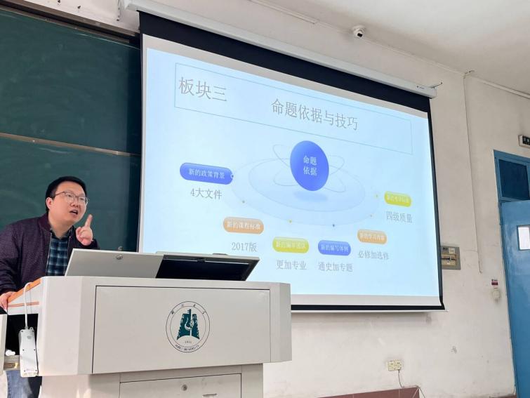 2024年10月28日上午,来自恩施高中的刘涛老师在4号教学楼607教室为我院师生做了以“基于学生成长阶段性特征的中学历史学科试题供应探究”为主题的精彩讲座。此次讲座由我院刘馗老师主持,22级历史学(师范)专业本科生和23级、24级学科教学(历史)专业研究生聆听了本次讲座。