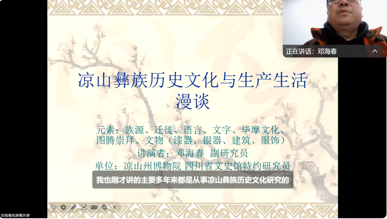 3月23日晚,凉山彝族自治州博物院副院长邓海春老师应邀为历史学(师范)专业做了题为“凉山彝族历史文化与生产生活漫谈”的线上讲座。讲座由历史系教师祝昊天主持,2022、2023级历史学(师范)专业本科生和部分研究生参加本次讲座。