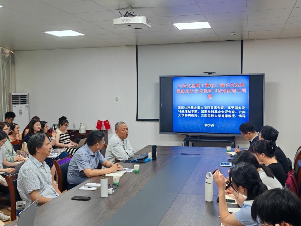 6月16日下午,云南大学特聘教授,云南民族大学首席教授、博士生导师和少英教授做客我院春秋讲坛,作了题为《全球化视阈下澜沧江湄公河流域民族历史文化保护传承的若干问题》的报告。太阳成集团特聘教授郑晓云教授主持,副院长雷平教授、中国古代史教研室主任张敏副教授和部分硕博研究生参加了此次讲座。在长达两个小时的讲座中,和教授以宏阔的全球化视角为切入,从全球化时代的民族文化、澜沧江湄公河地区民族文化的特色、民族历史文化保护传承的两个实例、民族历史文化保护传承的若干问题四个方面系统剖析了澜沧江-湄公河这一关键跨境流域民族历史文化的独特价值与当下文化保护传承所面临的复杂挑战。