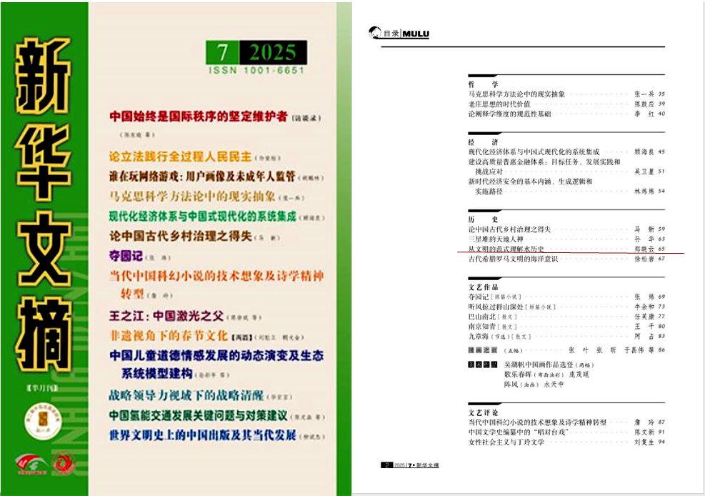 2025年第7期《新华文摘》转载太阳集团tyc33455郑晓云教授文章《从文明的范式理解水历史》,该论文发表于《社会科学战线》2025年第1期。