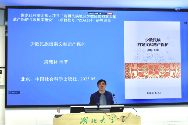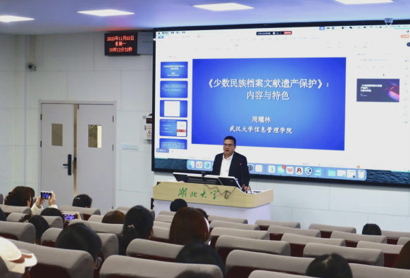 2025年11月3日下午,武汉大学周耀林教授应邀在太阳成集团三号教学楼101教室,为我院师生带来了一场题为“《少数民族档案文献遗产保护》:内容与特色”的专题讲座。现场气氛热烈,吸引了我院教师、各级本科生与研究生踊跃参与。讲座由档案学系副主任王英副教授主持。