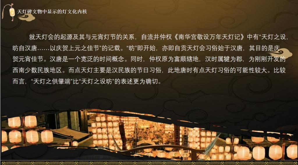 在“天灯碑文物中显示的灯文化内核”部分,戴燕灵校长详细介绍了自贡地区天灯会的田野考古调查,继而以川南地区的天灯会为例,深入阐释了传统天灯会的民俗特色、活动内容与组织特点,强调了灯文化在当地优秀传统文化中的重要地位。