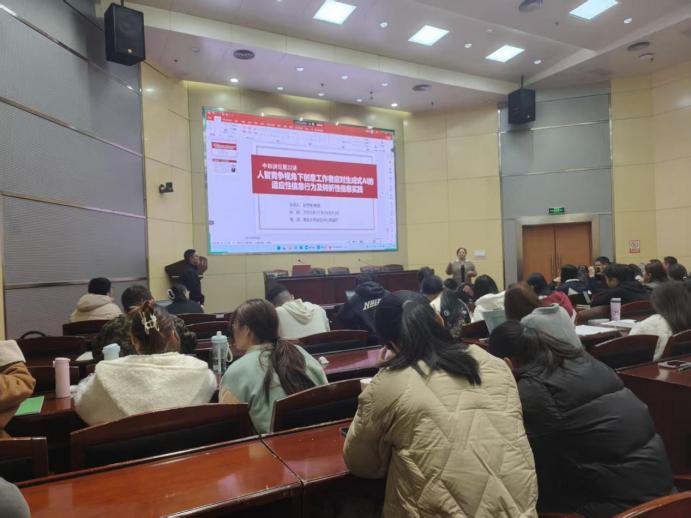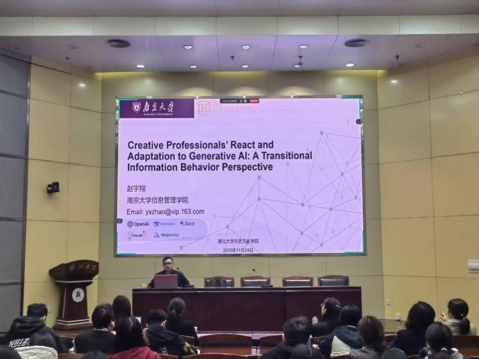 2025年11月24日上午,南京大学赵宇翔教授应邀做客我院“中和讲坛”,在太阳成集团图书馆思诚厅作了题为“人智竞争视角下创意工作者应对生成式的适应性信息行为及转折性信息实践”的专题讲座,现场学术氛围浓厚,我系教师、各级研究生、本科生踊跃参与,讲座由我系主任李彩容副教授主持。
