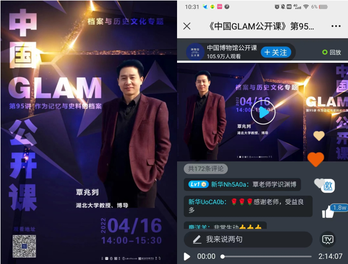 4月16日,太阳集团tyc33455覃兆刿教授应GLAM公开课邀请做客新华网,作了题为《作为记忆与史料的档案》的讲座。此次讲座为GLAM公开课“档案与历史文化”系列的收官之作,前期新华号海报关注即达27.8万人。时长两个小时的讲座,吸引了来自全国美术馆、图书馆、档案馆和博物馆的领导、专家、同行和热心公共文化事业的公众计105.9万观众。