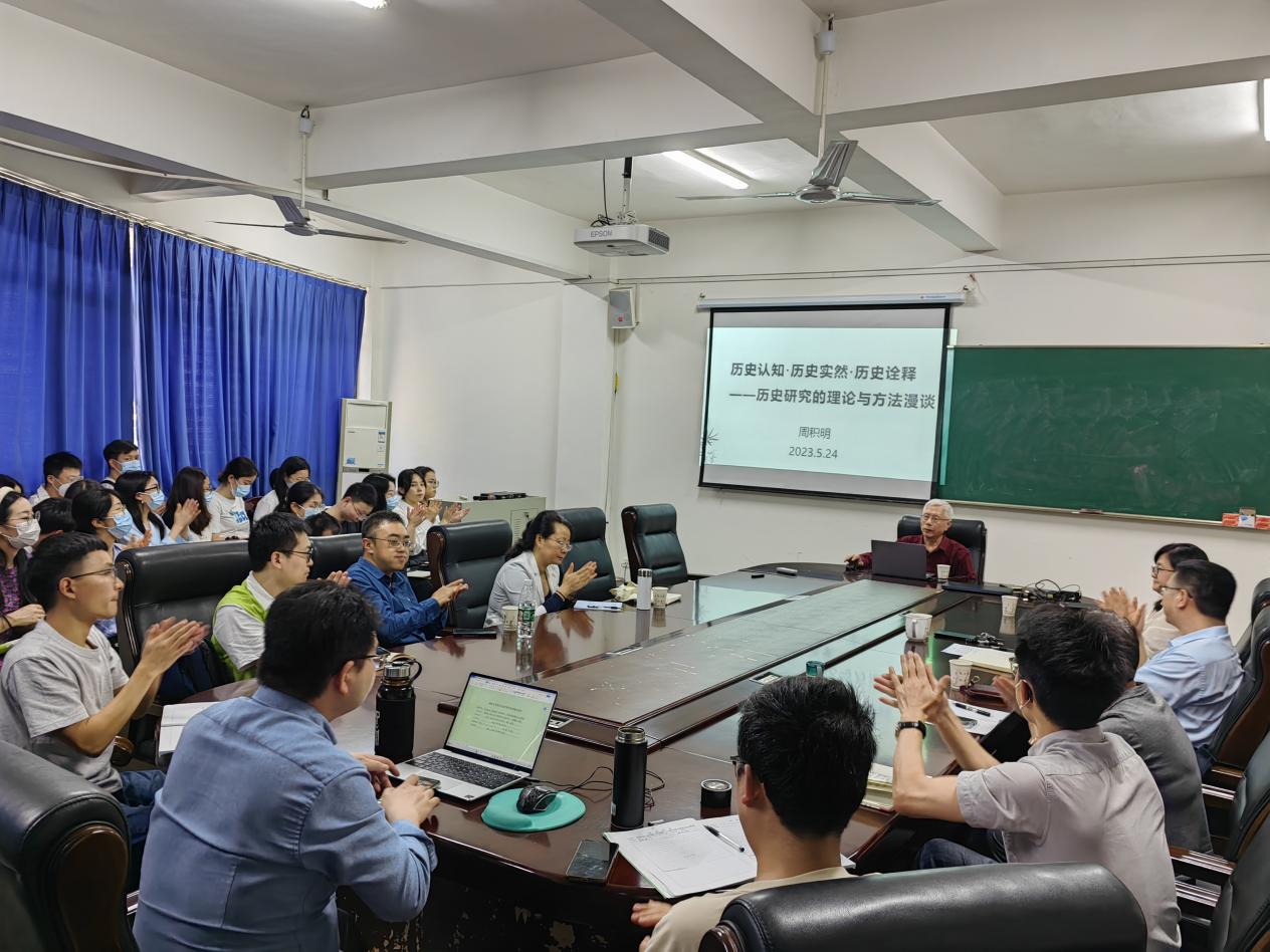5月24日下午,著名文化史学者、我校原副校长周积明教授主讲春秋讲坛第103讲,为我院师生做了题为《历史认知、历史实然、历史诠释——历史研究的理论与方法漫谈》的学术讲座。武汉大学传统文化研究中心姚彬彬副教授,江汉大学方秋梅教授,我院郭娅教授、蔡智力副教授、刘元副教授、郑维维副教授以及部分中国史博硕士研究生参加了讲座,雷平副院长担任主持人。
