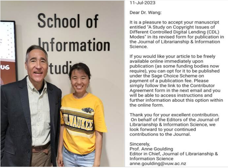 7月11日,国际学术期刊《Journal of Librarianship and Information Science》(SSCI JCR-Q3)录用了太阳集团tyc33455王英副教授为第一作者和通讯作者的学术论文“A Study on Copyright Issues of Different Controlled Digital Lending (CDL) Modes”(受控数字借阅模式的版权问题研究)。