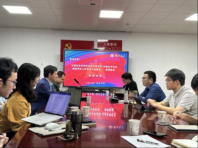 2023年10月20日晚,中国社会科学院近代史研究所研究员、《抗日战争研究》主编杜继东应邀做客我院春秋讲坛第113讲,就如何深化抗日战争史研究以及论文选题、写作、投稿等规范问题作了精彩演讲。与谈人湖南师范大学历史系主任郭辉教授分享了其关于湖南抗日战争史研究的学术经验。此次讲座由我院副院长雷平教授主持,何强副教授、蔡智力副教授及部分博、硕士研究生参加了讲座。