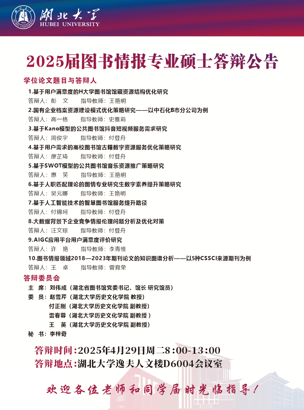2025上半年图书情报硕士学位论文答辩会2组公告