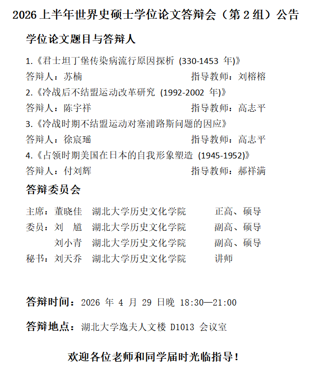 2026上半年世界史硕士学位论文答辩会(第2组)公告