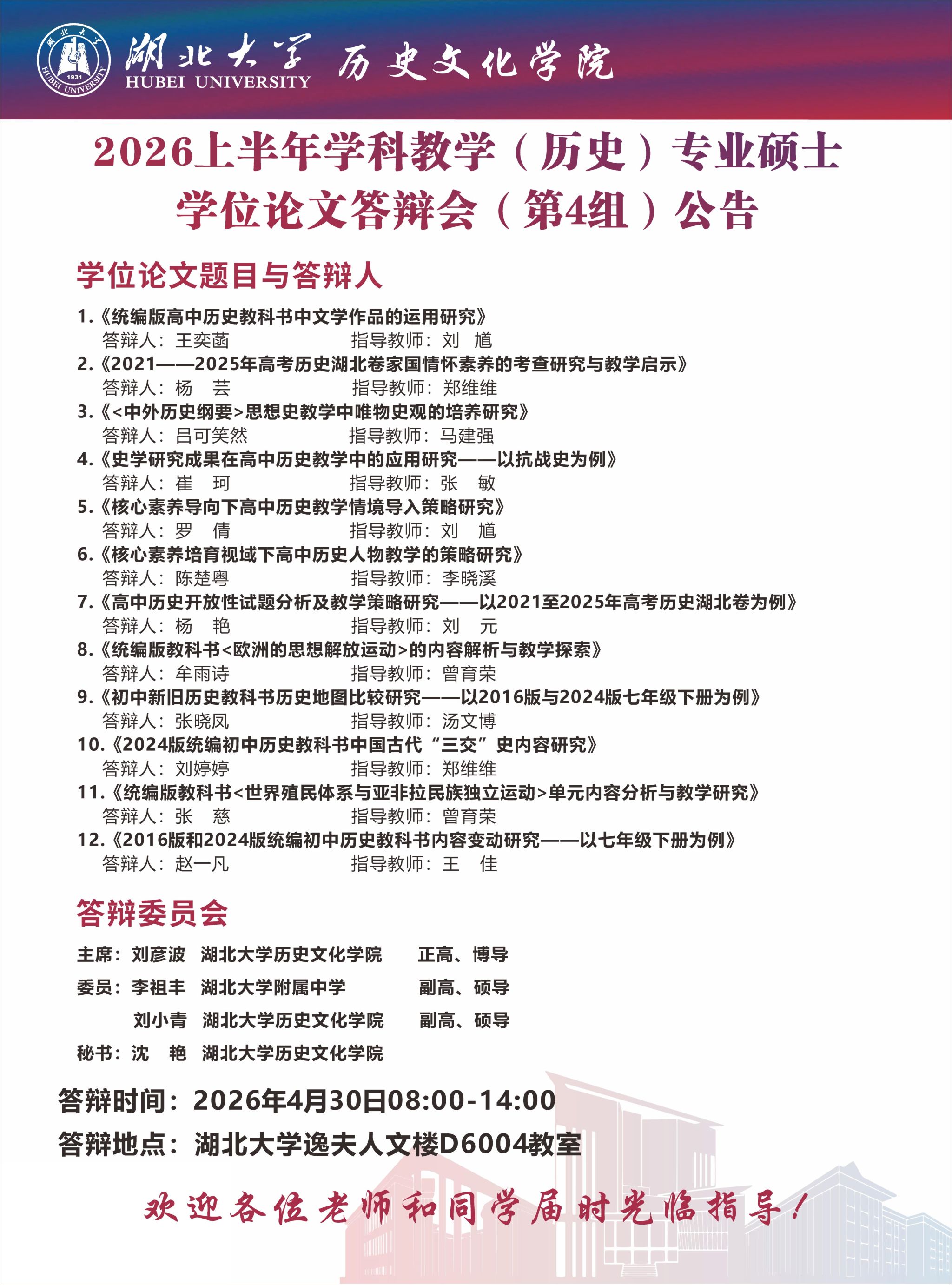 2026上半年学科教学(历史)硕士学位论文答辩会(第4组)公告