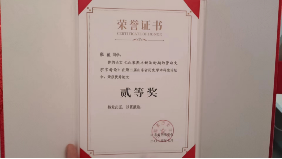 7月22日至23日,由山东省历史学会、山东大学主办,山东大学历史学院承办的“第二届山东省历史学本科生论坛”于山东大学中心校区顺利召开,我院2021级历史学(师范类)专业张薇同学的论文《北宋熙丰新法时期的管勾文字官考论》(指导教师:黄光辉)荣获二等奖。