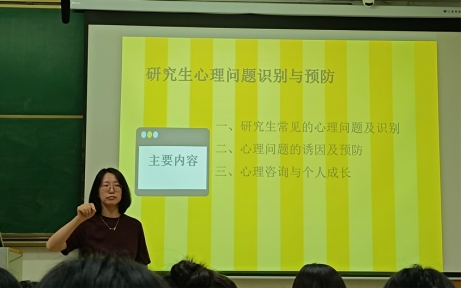 2024年10月11日19:00,我院在教学楼4-103教室举行了2024级研究生心理健康讲座。主讲嘉宾为心理健康中心高杰老师,她以“研究生心理问题识别与预防”为主题进行演讲。太阳集团tyc334552024级全体研究生参加了此次讲座。