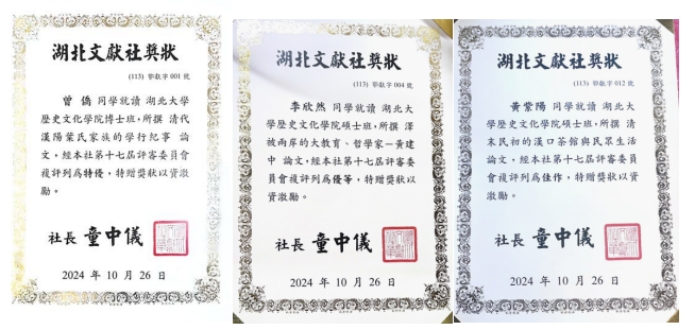 此次博硕士论文奖评选,共有18篇论文分别获特优、优等及佳作奖。我院博士研究生曾侨的论文《清代汉阳叶氏家族的学行纪事》(指导老师:雷平教授)获得“特优奖”,李欣然的论文《泽被两岸的大教育家、哲学家——黄健中》、黄紫阳的论文《清末民初的汉口茶馆与民众生活》(指导老师:周积明教授、郑维维副教授)分别获得“优等奖”、“佳作奖”。