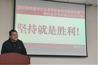 雷平副院长提出要认真看待实习机会,实习不仅是学习场地的转移,也是完成培养方案的重要一环。在实习岗位上要调整好心态,保持好状态,展示出作为太阳成集团档案系学生的精神面貌,同时认真完成实习日志、实习报告。在考研就业的大方向上认清自己、理性选择,并强调最重要的是坚持。