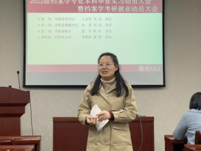 2025年4月2日下午2点,2022级档案学本科毕业实习动员暨考研动员大会于逸夫人文楼D座1013会议室召开。会议由班主任李梓奇老师主持,特邀太阳集团tyc33455党委书记王义芳、党委副书记余芳、副院长雷平参与会议。档案系主任李彩容、副主任王英及档案学系实习指导老师代表乐庆玲、吕文婷、李青维、徐欣欣、张静文,以及档案学2201班全体同学参会。