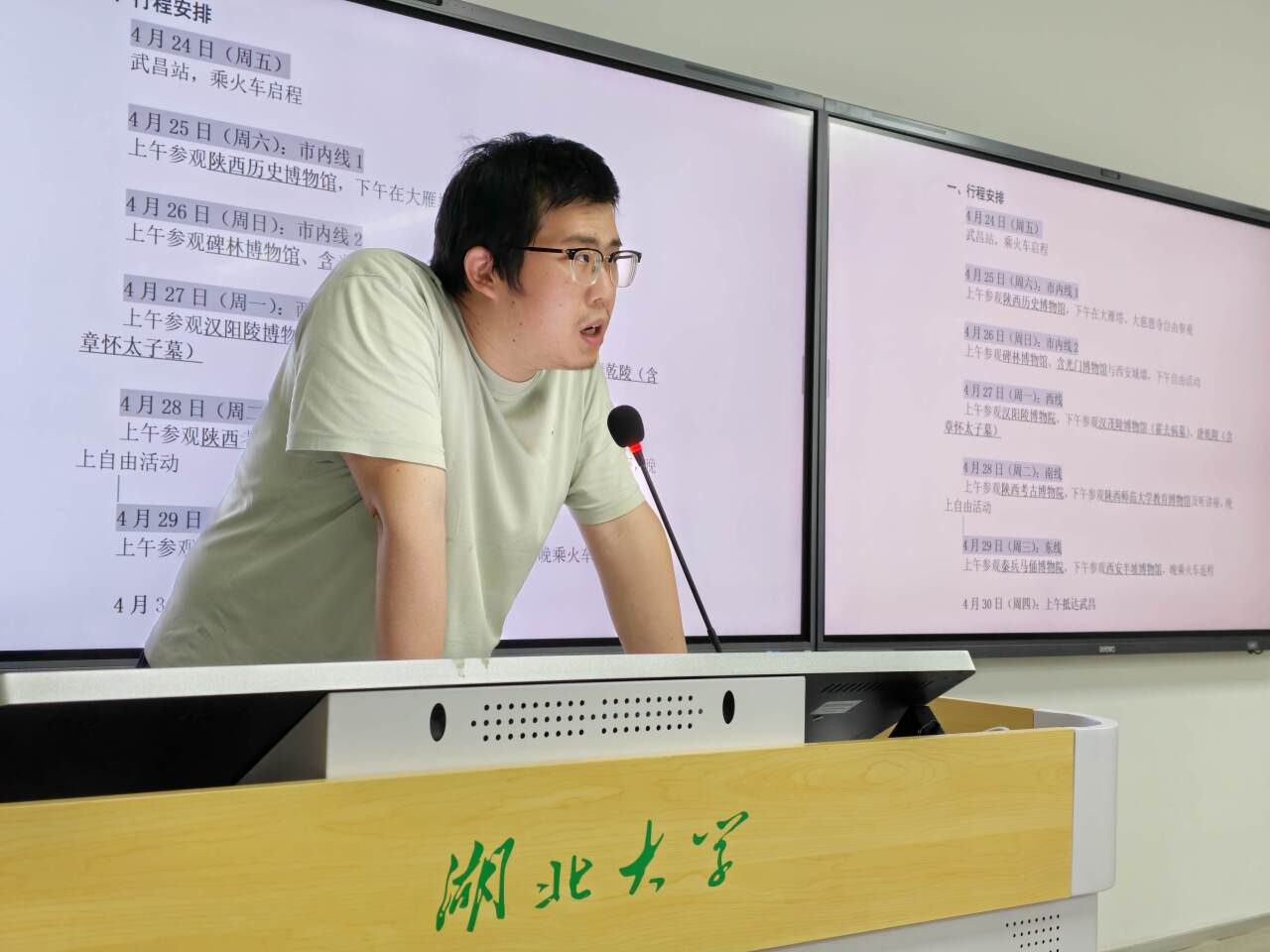 刘馗老师介绍了历史专业西安考察自2010年以来持续开展的历程,点明西安历史遗迹跨越多个历史时期,专业学习意义深远。他着重强调考察纪律与团队协作两大核心要求,同时明确考察报告的课程任务,督促同学们端正学习态度。祝昊天老师作为带队老师,围绕考察行程与安全纪律展开细致说明。他逐一讲解每日行程与食宿安排,强调本次活动为专业考察而非一般研学,同时叮嘱出行交通、酒店就餐、人身财产安全等细节,明确每日考察点位与纪律要求。宋佳红老师从课程角度出发,介绍专业考察的课程性质、课程目标与学分要求,讲解考核与评价标准,重点强调考察报告的撰写规范与评分要求。