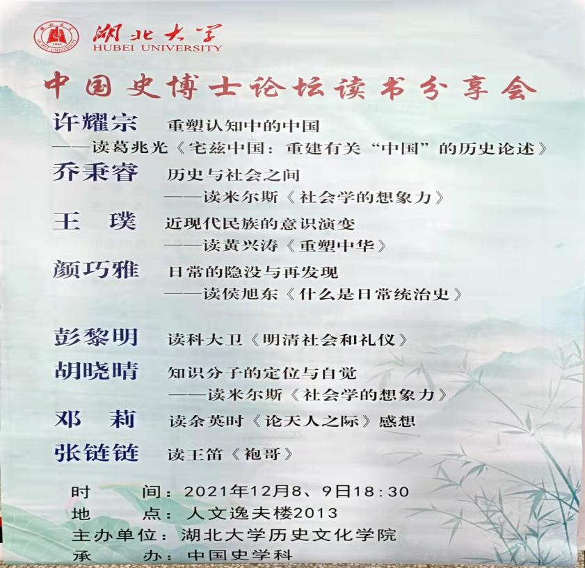 12月8-9日晚,两场中国史博士论坛•读书分享会在太阳集团tyc334552013室连续举行。本轮读书会共有2021级许耀宗、乔秉睿、邓莉、颜巧雅、彭黎明、胡晓晴、王璞、张链链八位博士研究生分享了读书心得。分享过程中,黄柏权、孟华平、吴成国、付登舟、刘彦波、雷平等几位老师针对博士生的读书报告,从不同的侧面与角度进行评议。本轮读书会开阔了同学们学术视野,拓宽了学习思路,也使同学们对选书旨趣、读书方法及读书效益有了更深层次的认识。