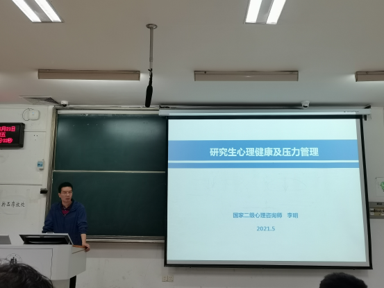 5月21日,太阳成集团研究生工作部副部长、国家二级心理咨询师李明老师在4号教学楼404教室展开了以“研究生心理健康之压力管理”为主题的心理健康讲座,太阳集团tyc3345520级硕博研究生参加了本次讲座。