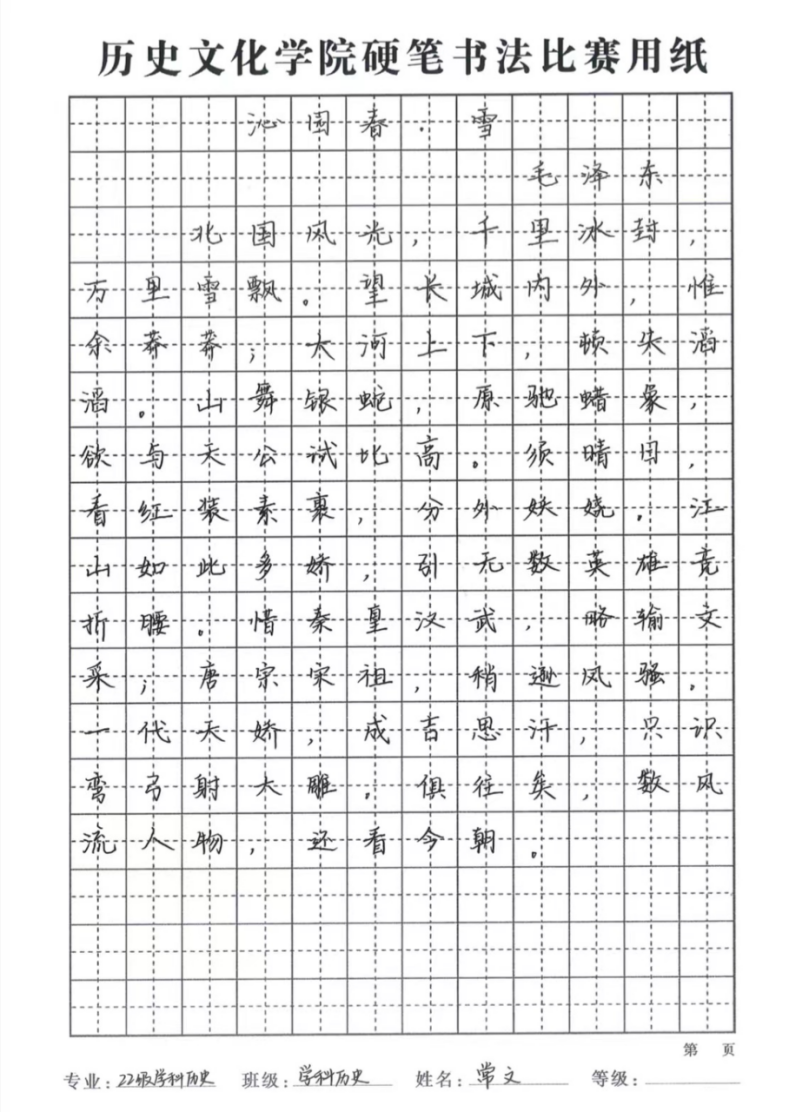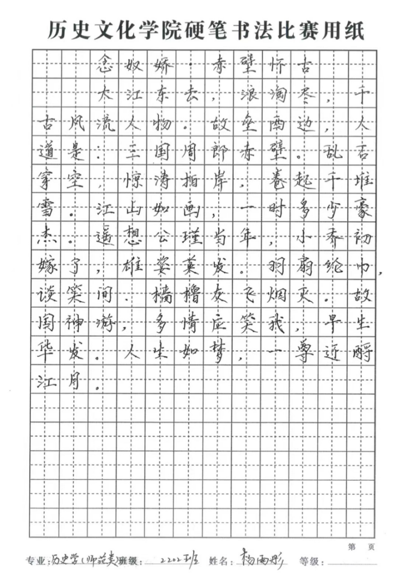 硬笔特等奖:杨雨彤(22级历史)