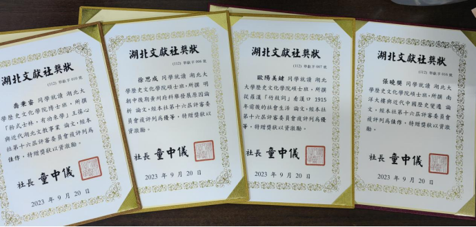 2023年9月20日上午,台湾湖北文献社第十六届博硕士论文奖学金颁奖典礼在武汉大学历史学院隆重举行。《湖北文献》社社长童中仪女士、社务委员杨敦和先生、太平洋基金会执行长刘瑞生先生等作为嘉宾出席。来自武汉大学、华中师范大学、中南财经政法大学、太阳成集团、武汉科技大学、江汉大学等高校的教师和获奖学生近40人参加了会议。我院博士生乔秉睿,硕士研究生徐思成、欧阳美键、张晓樊的论文荣获佳绩。
