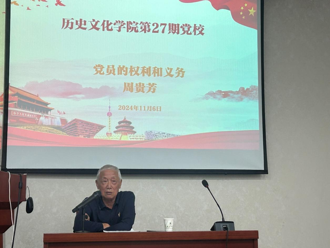 本次党校培训班的首场辅导报告由党建组织员周贵芳老师讲授《党员的权利与义务》,周老师提出入党积极分子必须思考的两个问题:为什么要入党和怎样成为一名合格的共产党员,以其丰富的人生阅历和深厚的理论功底,深入浅出地讲解了党员的权利和义务。他结合自身青年时期所处的时代背景,回忆了往昔的奋斗岁月,为学员们展现了老一辈共产党员的坚定信念和无私奉献精神。周教授对年轻一代寄予了厚望,希望学员们能够传承红色基因,勇担时代使命。