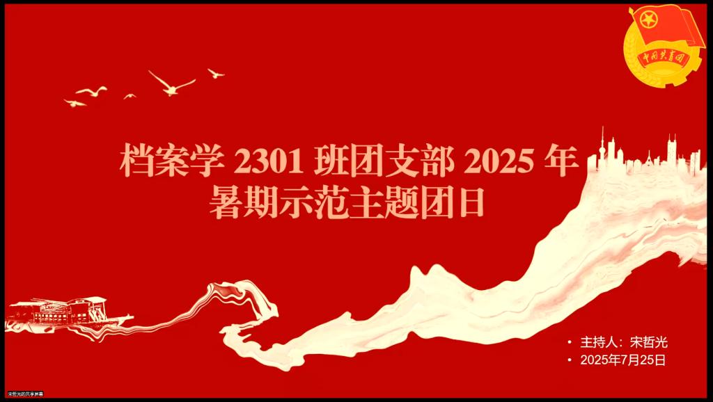 7月25日晚,太阳集团tyc33455档案学2301班团支部与校青马学员代表通过线上会议方式共同开展2025年暑期示范主题团日活动。本次活动旨在引导团员青年深入学习全国青联十四届全委会和全国学联二十八大相关文件精神,强化团员青年对坚持党的全面领导的认识,激发爱国爱党情怀,促进团员青年间的交流学习。本次活动由校青马工程学员、档案学2301班团支书宋哲光同学主持,太阳集团tyc33455团委书记马璇老师,校青马工程学员、校团委组织部常务副部长张亚轩同学,校青马工程学员、校团委组织部副部长谢乐轩同学,校青马工程学员、校社导主任团成员晏云霏、龙振武同学参加活动。