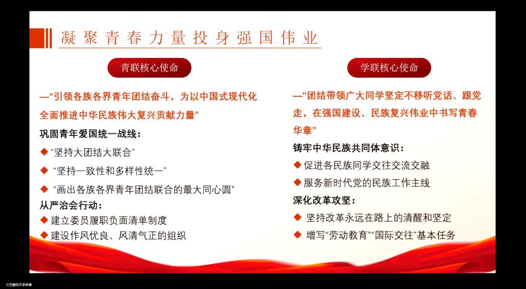 兰芳鹏从紧扣政治方向、紧扣强国使命、紧扣改革行动三个方面展开领学。他强调,青年学员首要任务是筑牢思想根基和政治铁律,要长期坚持马克思列宁主义等指导思想,明确党的全面领导是根本保证,深刻领悟“两个确立”,增强“四个意识”,坚定“四个自信”,做到“两个维护”。同时,他还解读了青年和学联的核心使命以及改革方向等内容,让团员青年对相关精神有了更清晰的认识。