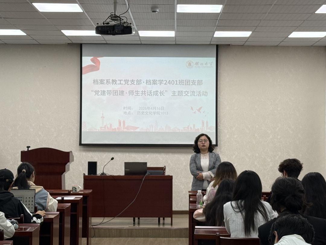 2026年4月16日,档案系教工党支部与档案学2401班团支部联合举办主题交流活动,党支部书记赵雪芹老师、系副主任王英老师、张静文老师(档案学2401班主任)作为教师党员代表,围绕专业能力提升、职业生涯规划相关话题,与同学们进行交流对话。档案系教工党支部书记赵雪芹老师围绕学生对于未来发展规划的困惑,提出夯实专业基础、积累实习经验、灵活利用学术资源与学习平台的宝贵建议。