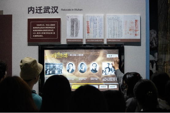 随后,全体师生来到华中科技大学校史馆。进入校史馆,映入眼帘的是朱红色的走廊,庄重清雅之感使人沉浸其中。校史馆主要分为三个单元:在新中国的朝阳中诞生、在共和国的旗帜下成长、在改革的开放中腾飞,深厚悠久的校史与极具科技感的陈展技术相结合,使同学们在感到新奇、震撼的同时,也更加了解华中科技大学的发展历程。