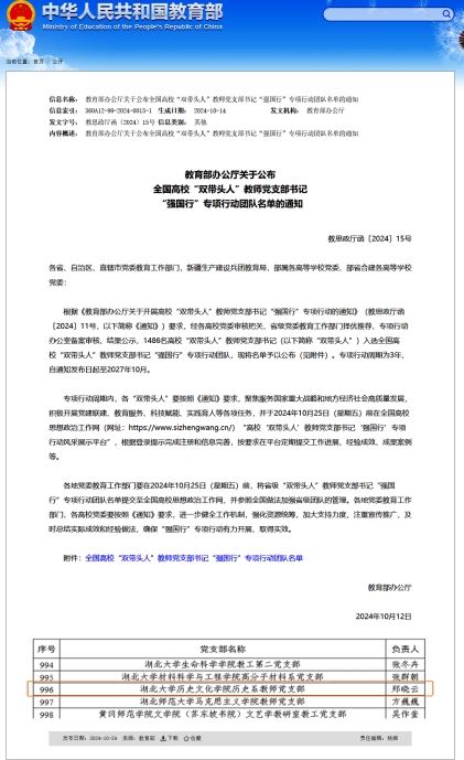 近日,教育部发布了《关于公布全国高校“双带头人”教师党支部书记“强国行”专项行动团队名单的通知》,太阳成集团历史系教师党支部入选全国高校“双带头人”教师党支部书记“强国行”专项行动团队。