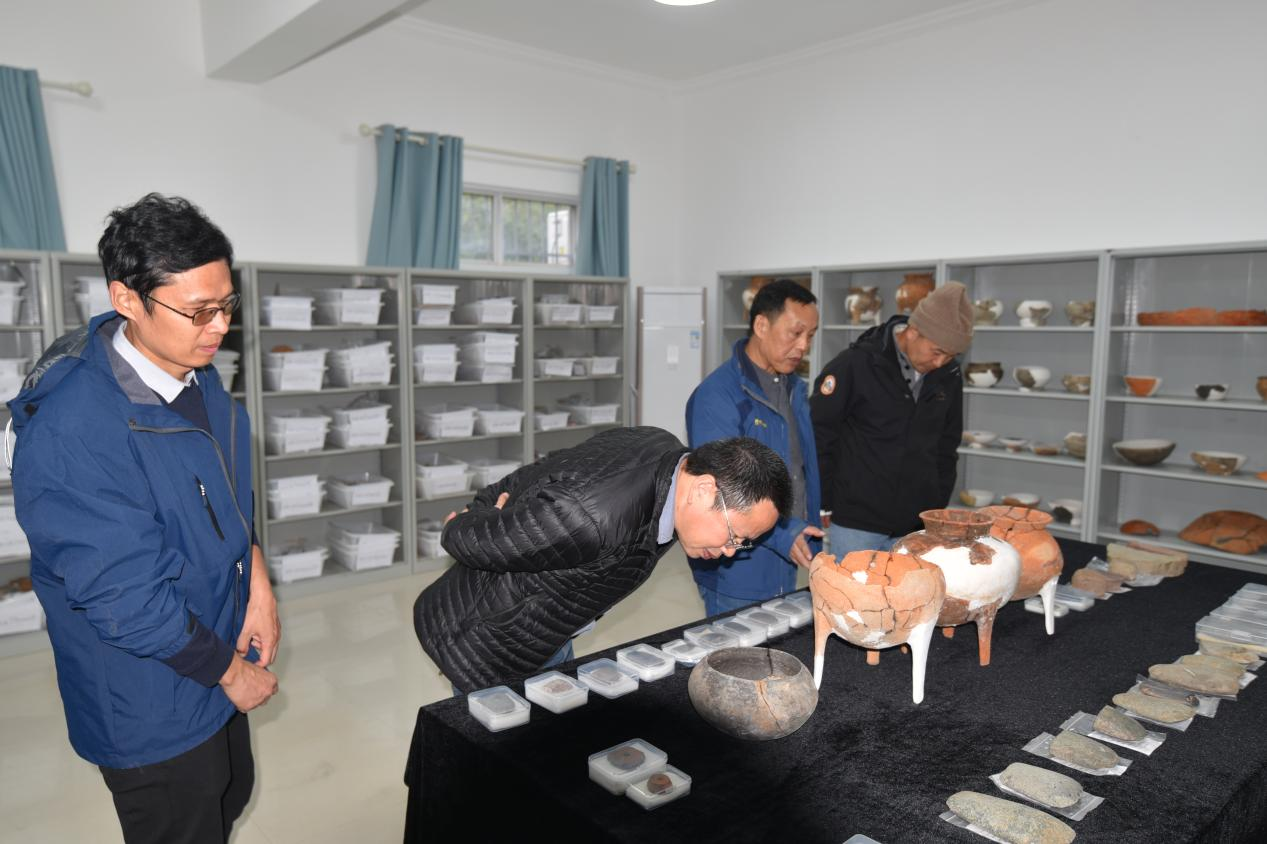 专家组前往钟祥边畈考古教学实习基地,实地考察了文物整理室和文物库房,仔细查看了2024至2025年度边畈遗址出土的各类文物,详细了解文物分类、保管及整理情况。期间,专家组听取了赵俊杰老师关于2025年度边畈遗址考古发掘阶段性成果汇报,全面了解本年度工作的阶段性收获。同时,专家组对工地记录本、探方日记、遗迹资料、小件登记表等原始发掘档案进行了系统查验,并对考古资料数字化工作及信息管理平台的应用情况进行了全面验收,充分肯定了项目在田野记录规范化与信息化管理方面取得的成效。