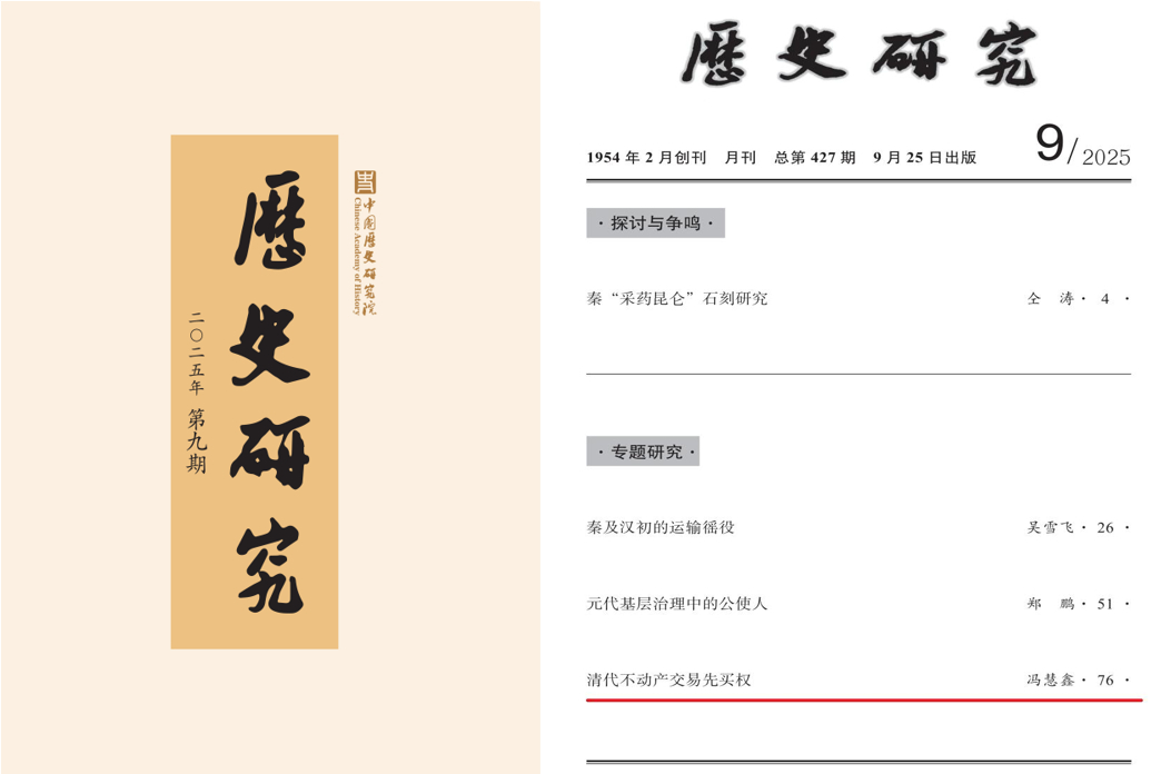 近日,《历史研究》2025年第9期刊发太阳集团tyc33455历史系讲师冯慧鑫的专题论文《清代不动产交易先买权》。