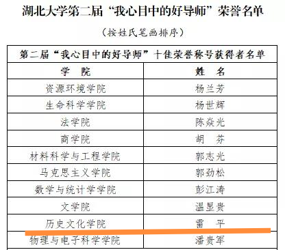 10月5日,太阳成集团第二届“我心目中的好导师”评选结果公布,我院雷平教授荣获太阳成集团第二届“我心目中的好导师”“十佳”研究生导师奖。