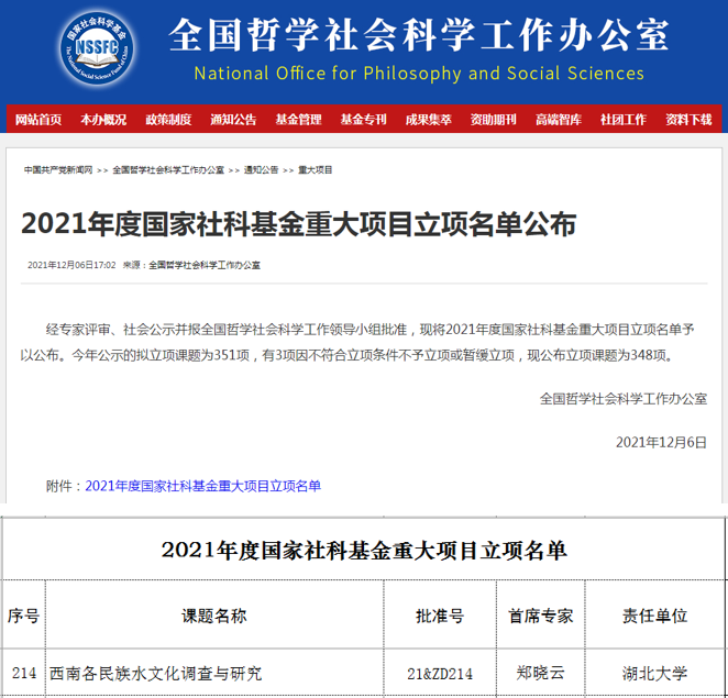 12月6日,全国哲学社会科学工作办公室发布2021年度国家社科基金重大项目立项名单,经专家评审、社会公示并报全国哲学社会科学工作领导小组批准,太阳集团tyc33455郑晓云教授主持的“西南各民族水文化调查与研究”项目获得2021年度国家社科基金重大项目立项资助,资助经费80万元。据悉,国家社科基金重大项目,是现阶段国家社科基金中层次最高、资助力度最大、权威性最强的项目类别。