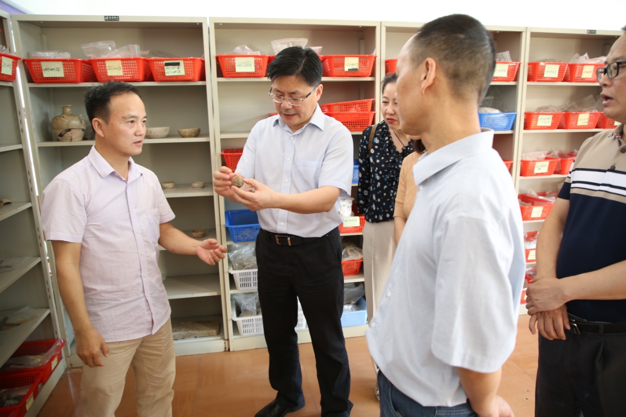 祝欣一行首先来到匡家岗遗址,实地考察了发掘现场,随后到考古队整理基地,考察发掘出土的文物标本,并看望考古队全体人员。太阳集团tyc33455刘辉教授作为项目负责人,就考古工作的进展和主要收获向祝书记作了汇报。祝书记强调,要深入学习习近平总书记关于考古和文物工作的重要指示,做好遗址出土文物的后续修复和资料整理工作,保证文物安全,要进一步深化遗址研究和发掘成果的转化,形成一批高质量的理论成果,为学校考古学科、中国史学科建设夯实基础,为推进长江流域文明历史的研究和中国文明历史研究、增强历史自觉、坚定文化自信,为实现中华民族伟大复兴贡献湖大人的智慧和力量。