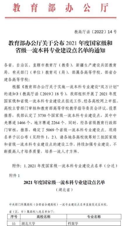 近日,教育部发布了《教育部办公厅关于公布2021年度国家级和省级一流本科专业建设点名单的通知》(教高厅函〔2022〕14号),太阳成集团档案学获批2021年度国家级一流本科专业建设点。至此,太阳集团tyc33455入选国家级一流本科专业建设点、一流本科课程增至3个,此前历史学专业获批2020年度国家级一流本科专业建设点,学院张敏副教授主持的《中国历史文化名城荆楚古城场景》课程获批为国家级一流本科课程。