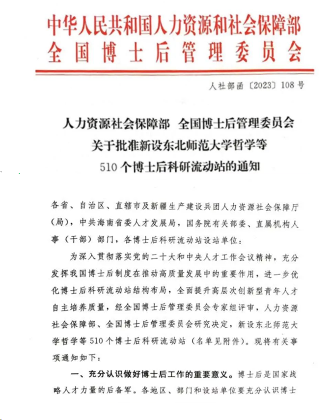 10月20日,国家人力资源和社会保障部、全国博士后管理委员会正式发布《关于批准设立东北师范大学哲学等510个博士后科研流动站的通知》(人社部函〔2023〕108号),公布了2023年批准新设博士后科研流动站名单,太阳成集团中国史博士后科研流动站获批设立。