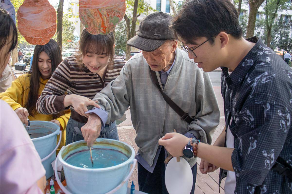 退休教师卢中平在工作人员指导下,制作了一把以红色为主色调的漆扇。她说,看到这么多青年学子来参加非遗活动,很有朝气,自己也忍不住前来体验。