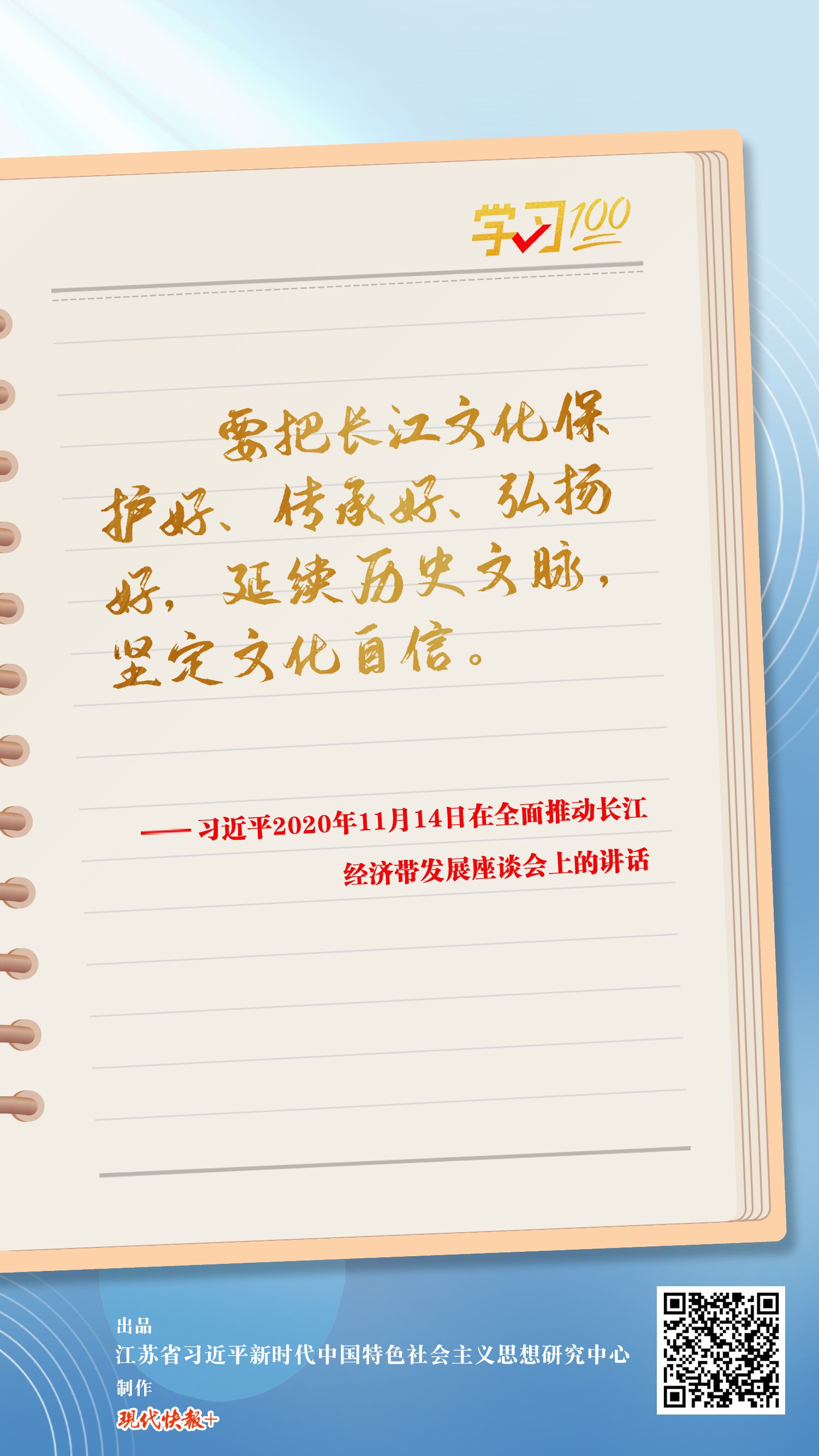 【本期金句】长江造就了从巴山蜀水到江南水乡的千年文脉,是中华民族的代表性符号和中华文明的标志性象征,是涵养社会主义核心价值观的重要源泉。要把长江文化保护好、传承好、弘扬好,延续历史文脉,坚定文化自信。——习近平2020年11月14日在全面推动长江经济带发展座谈会上的讲话