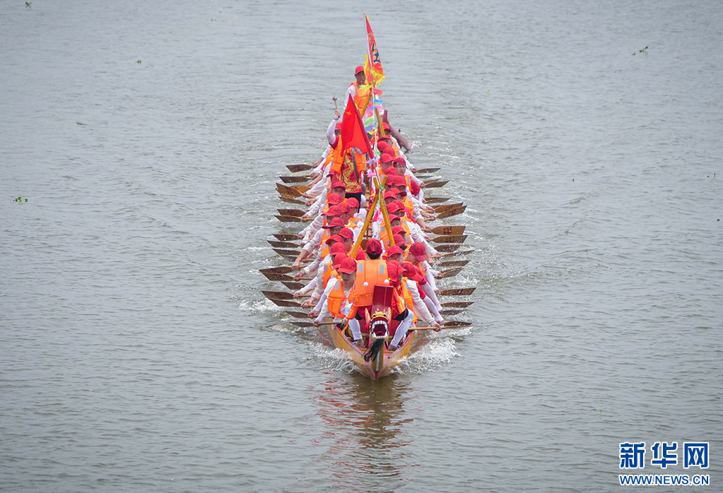 图为武穴群众在河道上划龙舟。新华网 李晓笛摄